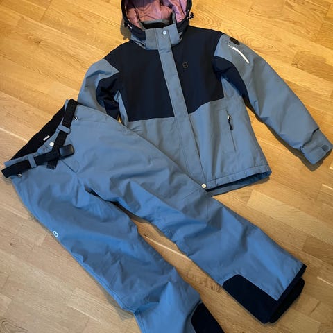 Jacka med avtagbar luva och matchande byxa med hängslen i fint skick.