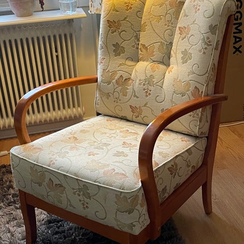 Säljer två vackra fåtöljer i svart färg med dekorativt mönstrat tyg och trädetaljer. Fåtöljerna har en elegant och tidlös design som passar bra både i vardagsrum, sovrum eller som accentmöbler.