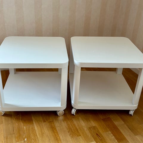 Bordens topp är kvadratisk med förvaringsutrymme under, på trissor.