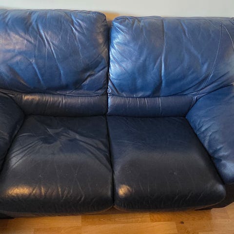 Äldre skinnsoffa, tyvärr inga mått för tillfället. Normalt slitage.