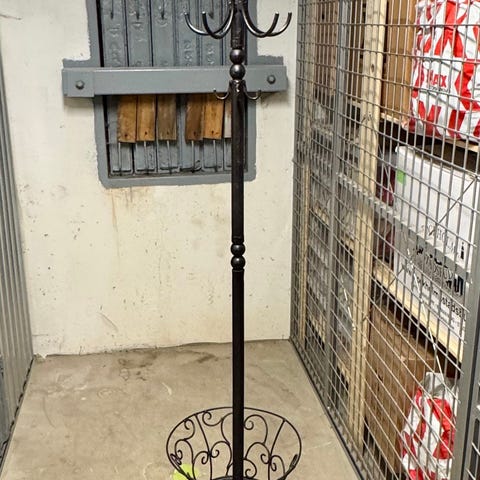 Tidlös svensk design från ca 1950-60-tal. Skulptural modell med flera böjda krokar i två nivåer samt stabil fot med ring. Mycket gedigen och dekorativ - passar perfekt i hall, butik, kontor mm
