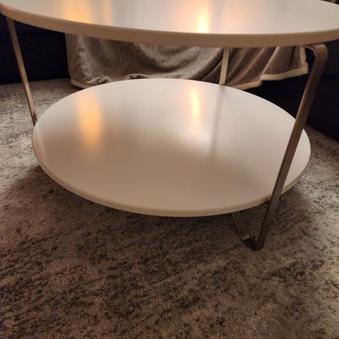 IKEA soffbord i vitt med oval form. Bordet har en hylla under bordsskivan för extra förvaring. Passar för vardagsrum och erbjuder en modern och funktionell design.