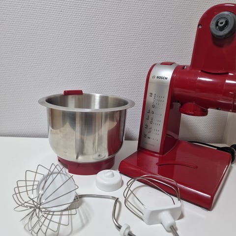 Bosch Universal köksmaskin med flera tillbehör inklusive visp, degkrok och olika skivor för skivning och rivning. Maskinen har en vit och rostfri design och är avsedd för mångsidig användning i köket.