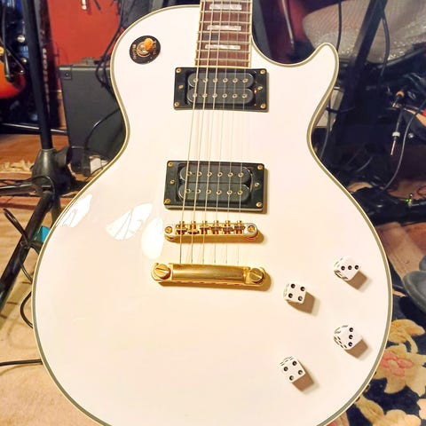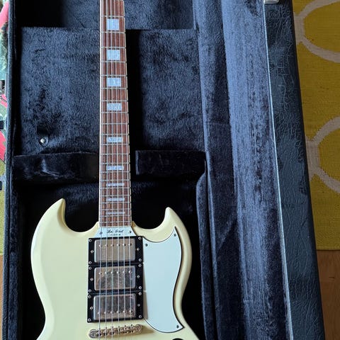 Köpt ny på Andreasson Musik hösten -25 och älskad sedan dess. Kvitto finns. Nya Gibson-lika "open book headstock", vacker mörk greppbräda och läcker "TV Yellow". Helt original förutom att jag satt "pointers" vid ton- och volymkontrollerna. Köpte sedan - korkad som jag är - en Gibson Les Paul Special. Du kan därför provspela sida vid sida med min Gibson och jämföra. P90:na sjunger rejält tycker jag..! =) Och en sak som skiljer från Gibson är faktiskt att Epiphone valt en ordentligt kompenserad tailpiece som standard.