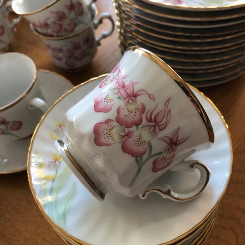 Ett halvt dussin kaffekoppar med fat och assietter från Gustafsberg i fint skick. Smal guldkant och rosa rosenknoppar i dekoren.