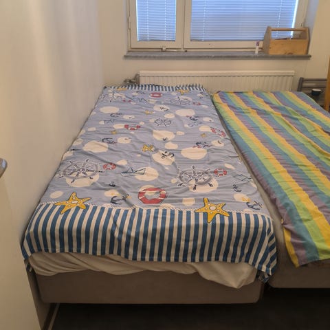 Very good condition small bed, mattress has small stains could be washed (free), bed is unashamed.
