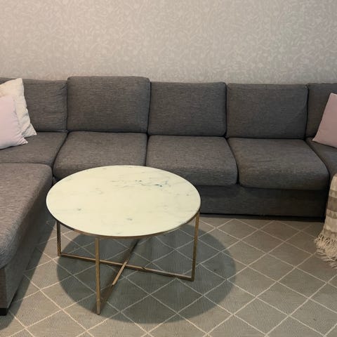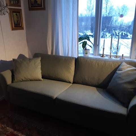 Sliten soffa skänkes mot avhämtning innan söndag kl 12. Har spruckit i sömmar som troligtvis kan sys.