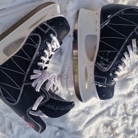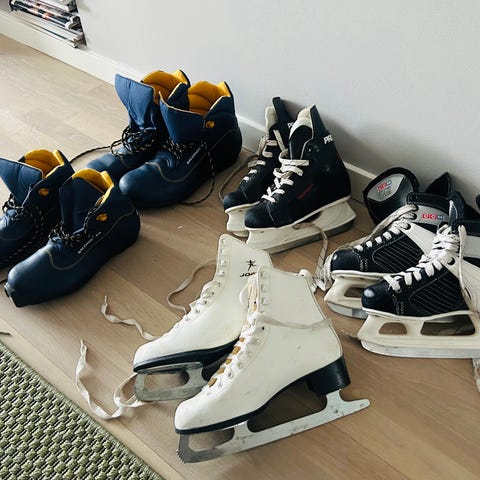 Två par barnskridskor samt hjälm