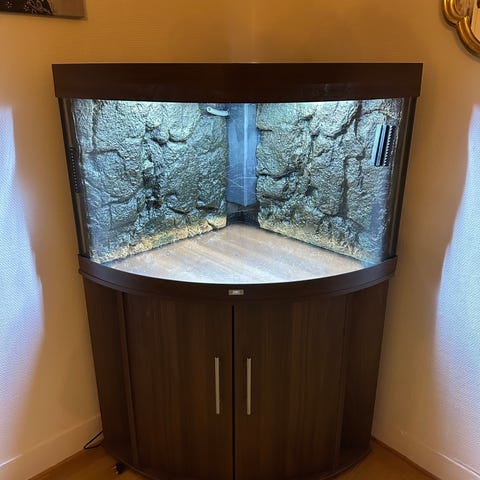 Ca 350liter Juwel akvarium hörnmodell med träskåp i mörk finish.