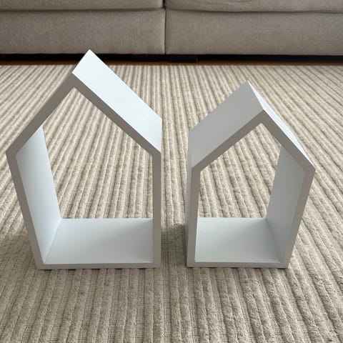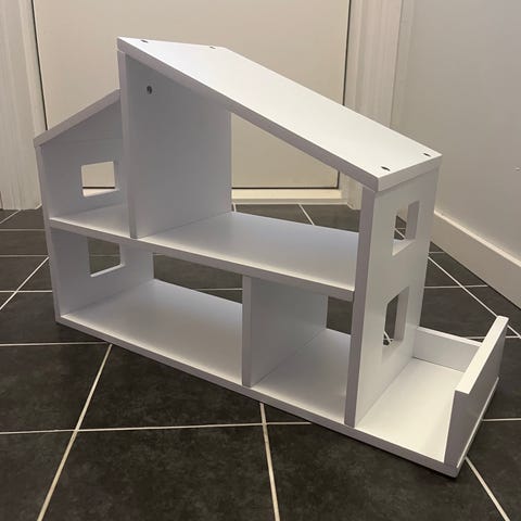 Grå golvbokhylla av märket Alice & Fox. Vi har snickrat en egen botten som gör att den står jämnt mot väggen och golvet om man har lite högre golvlister (eller låga :) Den delen går att ta bort.