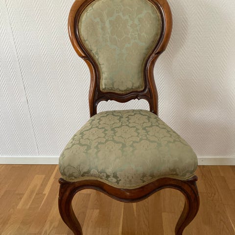 4st stolar i fornnordisk stil, med nitad sitt och ryggdyna i grönt tyg, väldigt ovanlig modell, brukslitage.