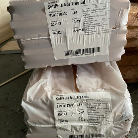 Stigmas furugolv A-sortering 26,5x180 mm. Inköpt på sundabyggvaror. Måtten är 384 cm långa och 18 cm breda (19 cm med spont). Paketet innehåller 3 stycken längder, vilket totalt motsvarar 2 kvm.