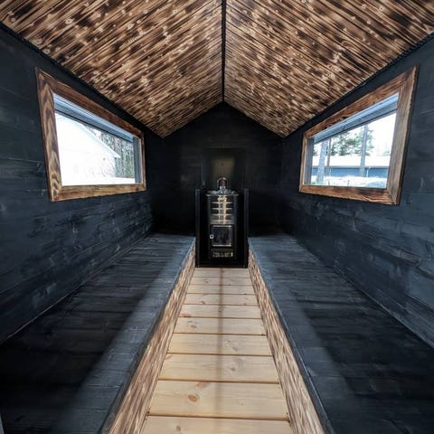 Välbyggd bastuvagn med vedeldad kamin, invändigt klädd med träpanel för en genuin bastukänsla. Bastun har 3 stora fönster som ger ett fint ljusinsläpp och utsikt mot omgivningen. Utrustad med bekväma sittbänkar samt en veranda med tak perfekt för avkoppling före och efter bastubad.