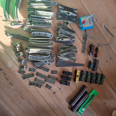 Brio träjärnvägset med flera träspår, broar, byggnader och tågfordon. Setet innehåller olika kurviga och raka spårdelar, röda brodelar, samt flera tågvagnar och tillbehör i trä och plast. Passar för barn och kan användas för att bygga och leka med tågbana.