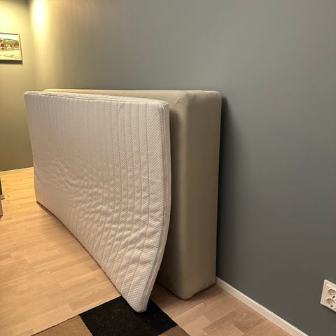IKEA Tustna bäddmadrass. Tjock, skön och fräsch. Snygg sänggavel 120 cm hög som står på golvet, smidigt. Matchande sängkappa och ben ingår.