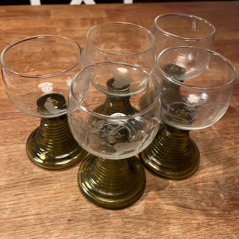Glasen har klassisk druv- och bladdekor, grön fot och levereras i svart metallställ med bärhandtag – typisk presentservis från perioden.