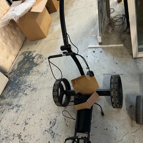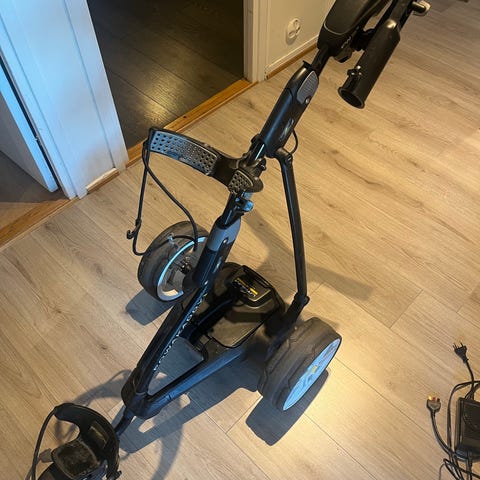 Mocad 3 eldriven golfvagn med lithium batteri. Utrustad med handtag för styrning och hjul för enkel transport av golfklubbor. Batteriet är av märket Caddy Cell, vilket möjliggör elektrisk drift av vagnen. Kommer med laddare och även paraplyhållare