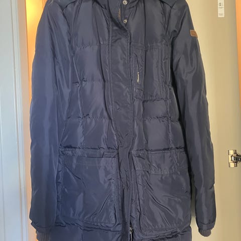 Blå vinterjacka i märket Everest. Luva med fuskpäls. Flera rymliga fickor framtill. Dragkedja samt knappar.