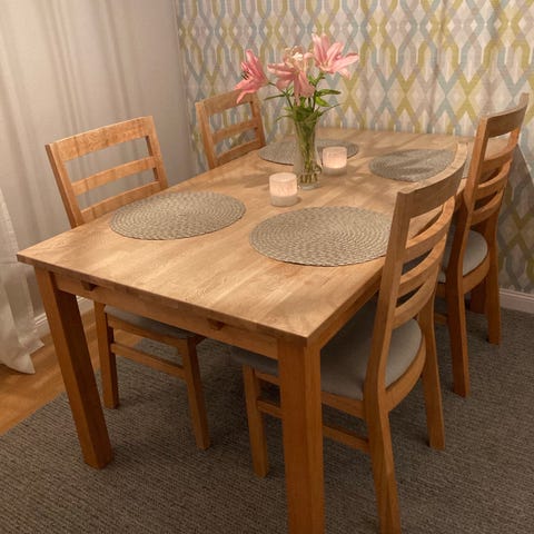 Matbord i massiv ek med 4 stolar med avtagbar och tvättbar klädsel. Klädseln finns i vitt och rött till samtliga stolar. En iläggsskiva, 50 cm, förvaras under bordsskivan.