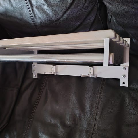 Hatthyllan har gavlar och 4 enkelkrokar av aluminium. Stänger av plastöverdraget stål. Med en extra stång. Levereras omonterad. Hyllan har bredd 1000 mm och utsprång 270 mm. Rördiameter 25 mm.