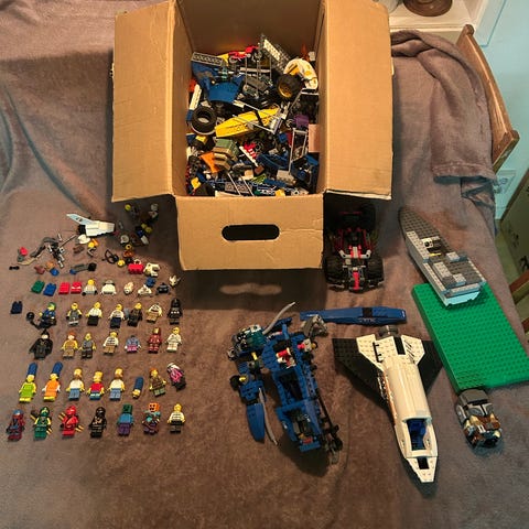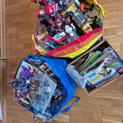 LEGO Star Wars, ninjago, city och mera byggsatser och delar i olika färger och former. Innehåller flera små byggdelar och figurer från Star Wars, ninjago och andra. Passar för samlare och byggentusiaster.