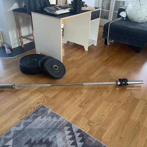 Totalt 140 kg skivor + stång. Vikterna är original Eleiko training bumpers, extremt slitstarka och färgkodade enligt IWF-standard. Inga sprickor eller liknande.