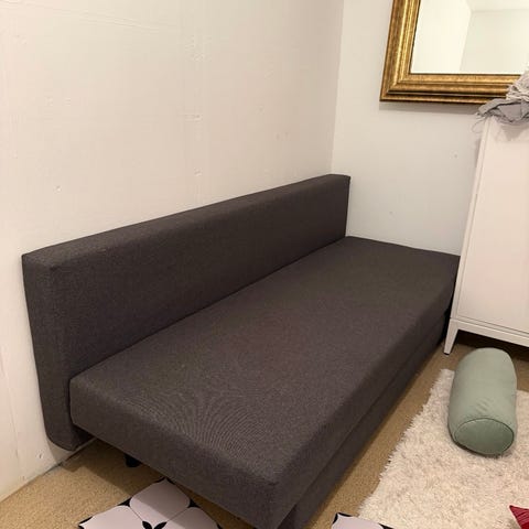 Soffan görs enkelt om till en säng. Sits och rygg i skum. 3-sits soffa med tygklädsel Sovyta. 106x190 cm. B209 x H82 x D83 cm