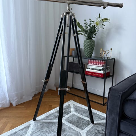 Väldigt vackert teleskop i mässing och mörkt trä.
