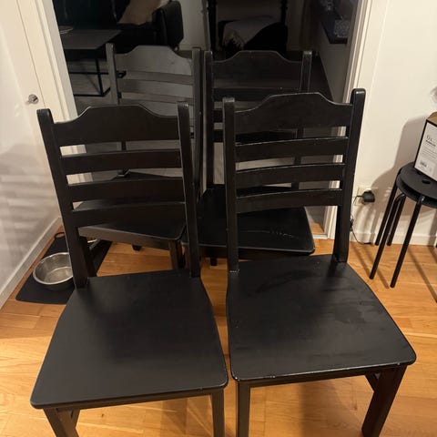 Avtagbart tyg, stoppad sittdyna och ryggstöd. Mörk trästomme. Synligt använda men hela och god kvalitet. Synligt slitage på ben och tyg. Behöver tvättas. Inköpta på Folkhemmer.
