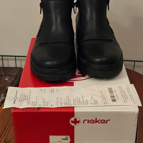 Svarta till färgen i skinn /mocka med gråbrunt fårskinn inuti. Stl 44.
