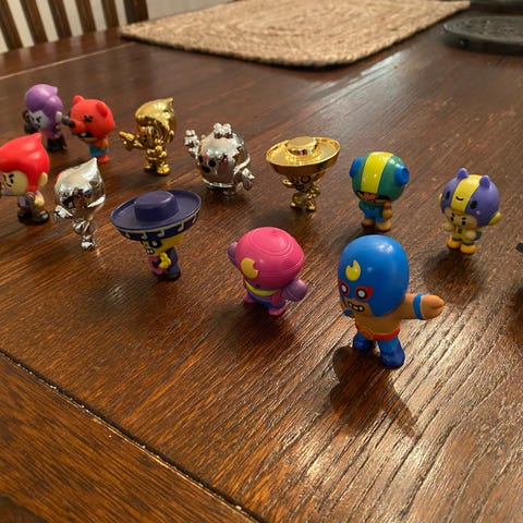 Brawl Stars Figurer Set med fem olika karaktärer i olika färger och utseenden. Passar för samling eller lek.