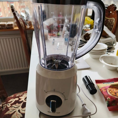 Sencor blender med justerbar hastighet i vit färg. Utrustad med en plastkanna och en kontrollknapp för att välja mellan olika hastigheter. Passar för allmän användning i köket för att blanda och mixa ingredienser.