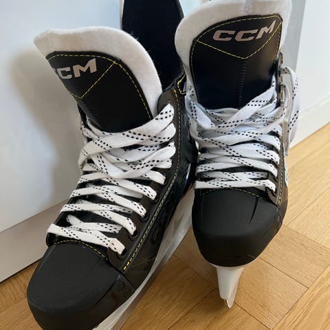 CCM ishockeyskridskor i barnstorlek 39. Skridskorna är svarta med grå detaljer och har vita skenor. De är avsedda för ishockey och har snörning för justerbar passform. Skenorna är av metall och skridskorna är designade för barn.
