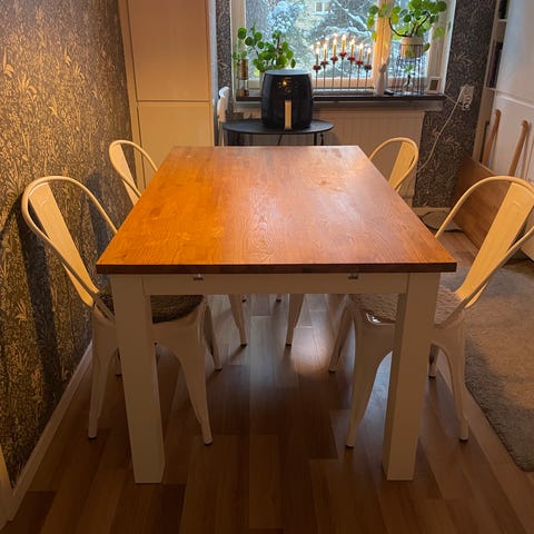 Bordet är i fint begagnat skick, några små skönhetsfel finns, (se bild) inget som påverkar funktionen.