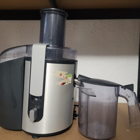 Russell Hobbs råsaftcentrifug i röd och svart färg. Utrustad med en stor matningsrör och behållare för juice och fruktkött. Kommer med bruksanvisning.