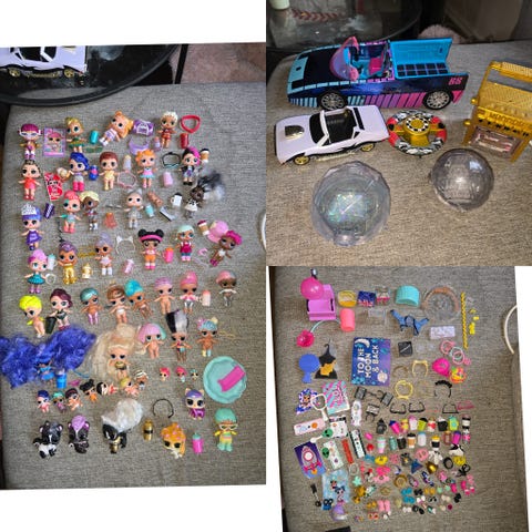 små LOL dockor med olika frisyrer, kläder och accessoarer. Setet innehåller även små husdjur och diverse små föremål som väskor, flaskor och skor. Passar för barnlek och samling.