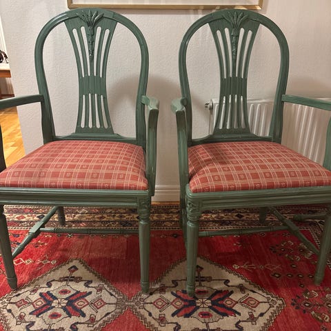 8 stycken. Renoveringsobjekt. Alla delar finns med. Några stolar har blivit ihop- skruvade (se bild). Säljes alla tillsammans.