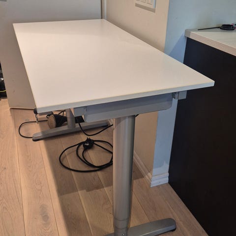 Säljer ett stilrent och praktiskt höj- och sänkbart skrivbord (63-125 cm) i mycket fint skick. Perfekt för hemmakontoret med smarta funktioner som håller ytan ren.