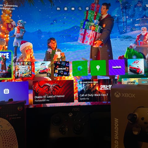 Microsoft Xbox One S spelkonsol i vit färg. Konsolen levereras med två trådbundna kontroller. Passar för användning med Xbox One-spel och tillbehör.
