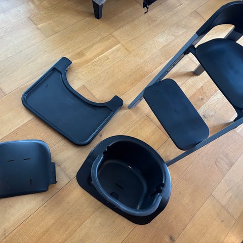 Stokke Matstol barnstol som är ny målad i en ljus beige nyans. Finns "penseldrag" men alla skav som var innan är bortslipad, grundmålad och sen målad i en beige färg.