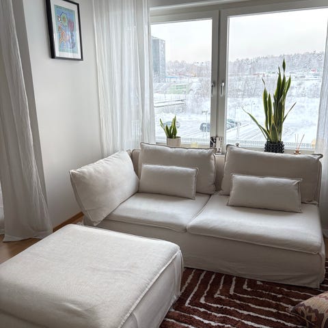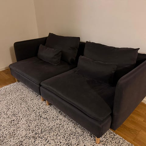 Soffan är i bra skick, inga skador i tyget och har använts i rök- och djurfritt hem. Avtagbar klädsel som går att tvätta.
