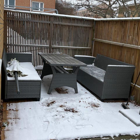 Utemöbel i svart rottingmaterial med en grå dyna. Passar för utomhusbruk på balkong eller terrass. Designad för att erbjuda sittkomfort och avkoppling.