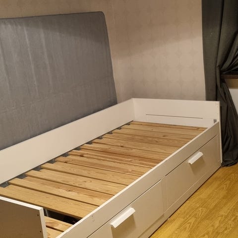 Bra skick men har märken efter färgpennor och tejp på flera ställen. Skänkes utan madrass.