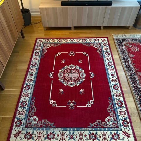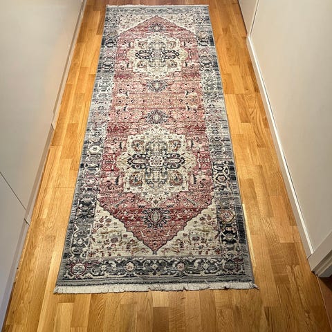 Elegant gångmatta i klassisk orientinspirerad stil, tillverkad i 100% ull. Varm rostrosa bottenfärg med vackert mönster i beige, brunt och svart.