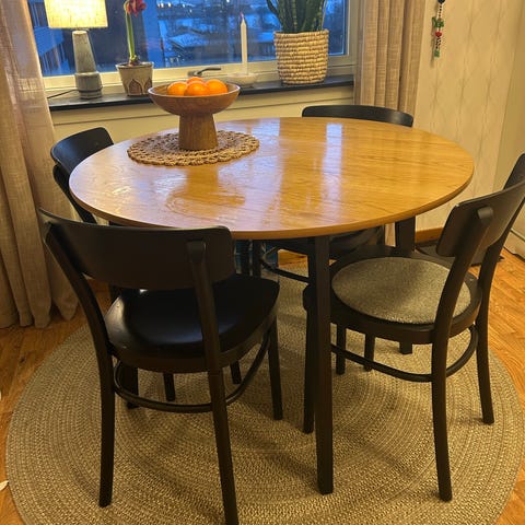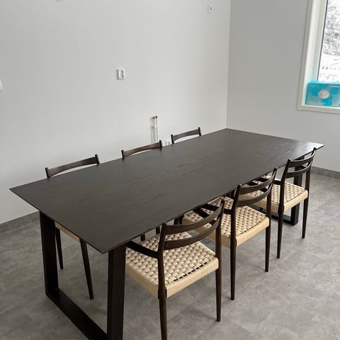 Vitt matbord med sex gråa stolar. Bordet serien Plaine, stolarna serien Tracy från Mio. Mått på bordet 180x95x74cm. Små skavanker på bordsskivan, inget som syns om man inte kollar nära. 3500:- för hela matgruppen. Finns i Sävast, Boden.