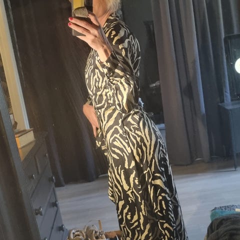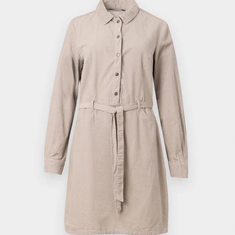 Vardagsklänning i tunn och mjuk denimkvalitet. Den har en klassisk skjortkrage och knappslå hela vägen ner fram. Långa ärmar med knapp i ärmslutet. Avtagbart tunt knytbälte i midjan. Snygga detaljer på sömmarna ner längs klänningen. Åtsittande passform och är utan stretch.