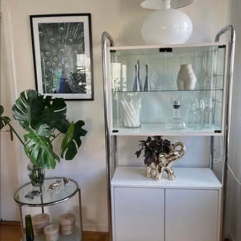 Säljer vårt stilrena IKEA MILSBO vitrinskåp i vitt, den lägre modellen.