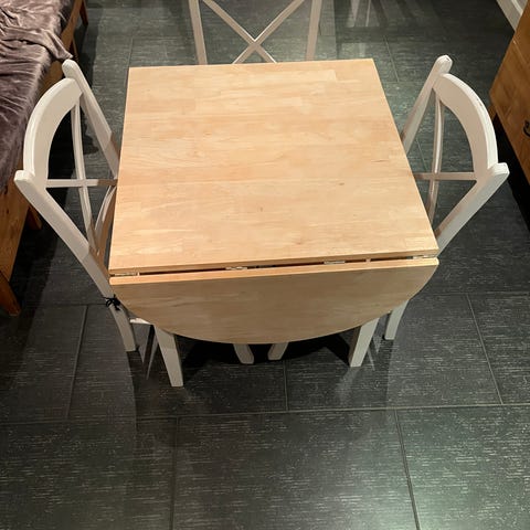 70-tal. Bordsskiva av laminat i mycket gott skick, visst slitage runt kanterna. 4 stolar i varierande skick. Inbyggda förlängningsskivor.