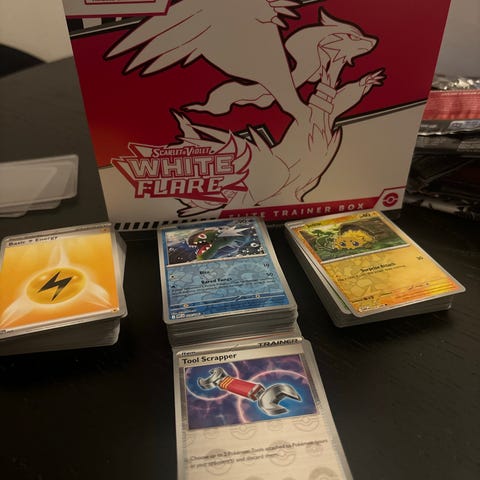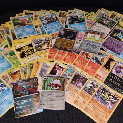 Samling av Pokémon-kort med olika karaktärer och egenskaper. Kortens storlek och material följer standard för samlarkort. Passar för spel och samling.