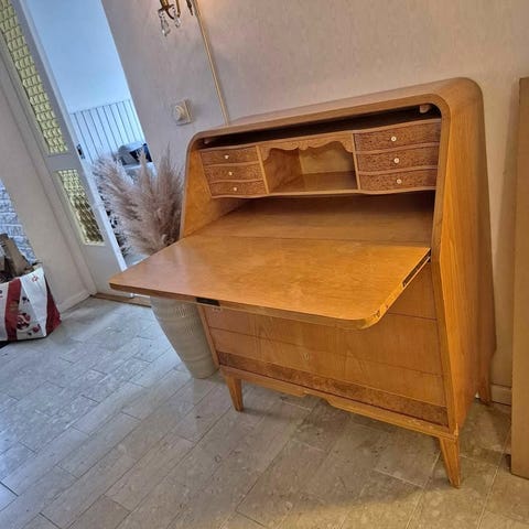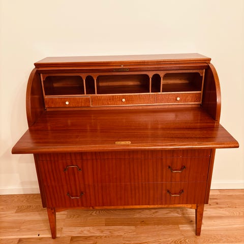 En fin sekretär i teak. Fungerar fint. Synliga fläckar på bordsskivan och lite småskavanker.